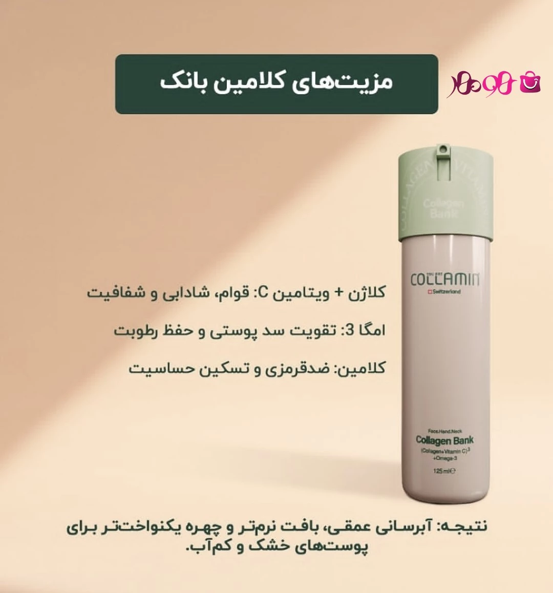 کلاژن بانک کلامین ترکیبی قدرتمند از کلاژن، ویتامین C و امگا ۳ که باعث آبرسانی عمقی، شادابی و شفافیت پوست و کاهش چینوچروک، بهبود بافت و یکنواختی چهره می شود. این محصول مناسب برای انواع پوست، بهویژه خشک و کمآب است که باعث تغذیه عمیق و تقویت پوست می شود. با مصرف کلامین پوست شادابی و شفاف خواهید داشت و به پوست کمک می کند که نرمی و لطافت طبیعی خودش را دوباره پیدا کند. بافت پوست یکدست می شد و حس کشسانی سالم و شاداب به پوست می دهد